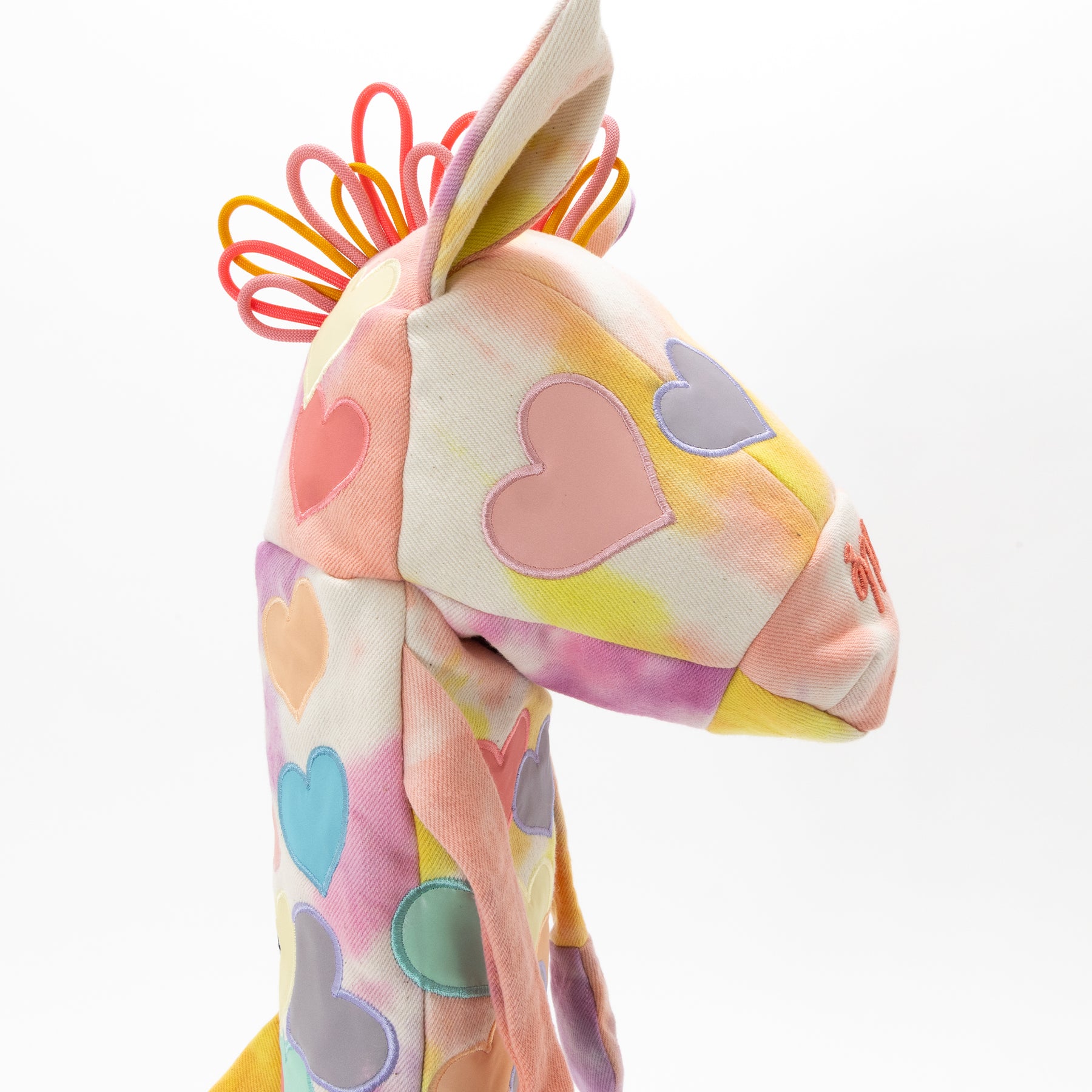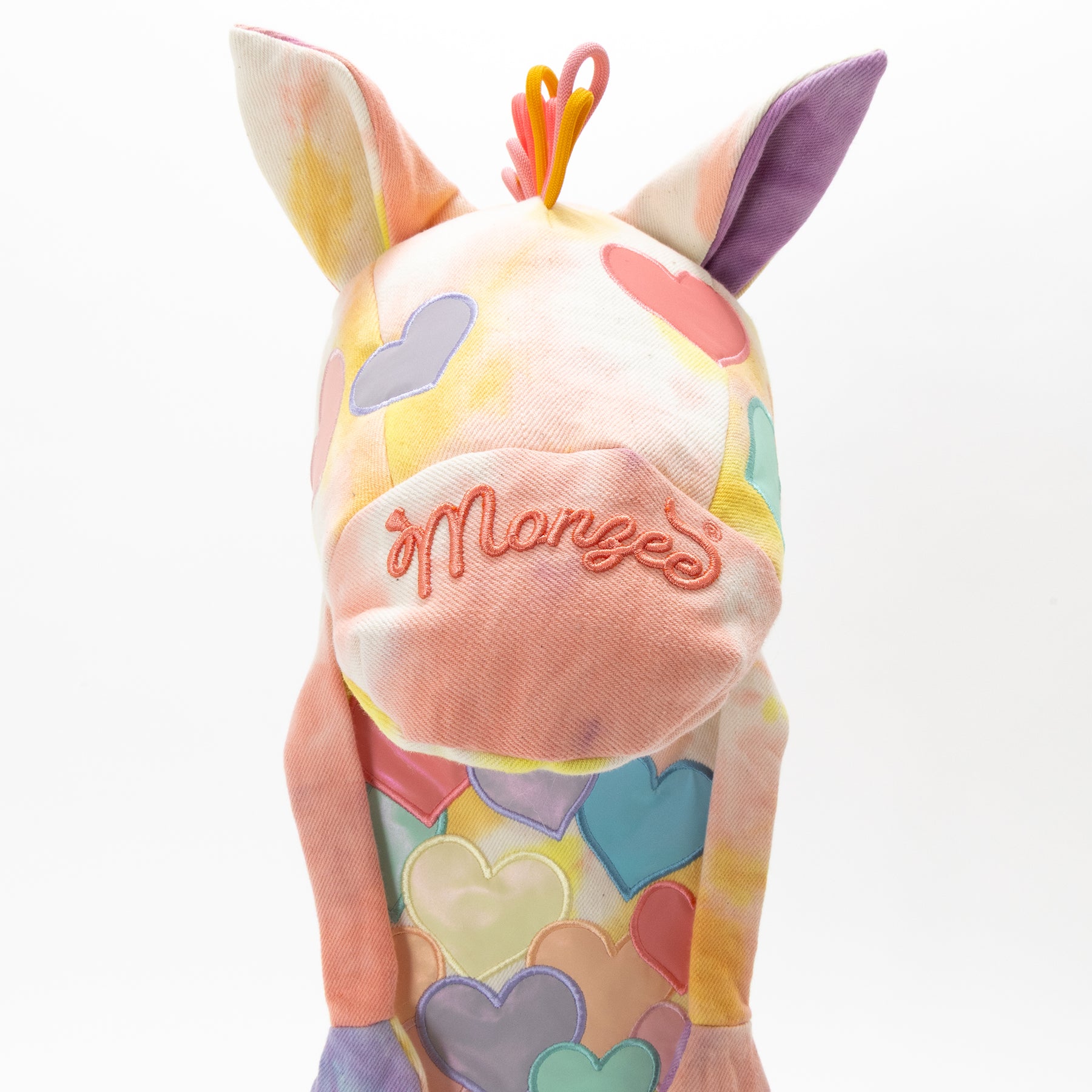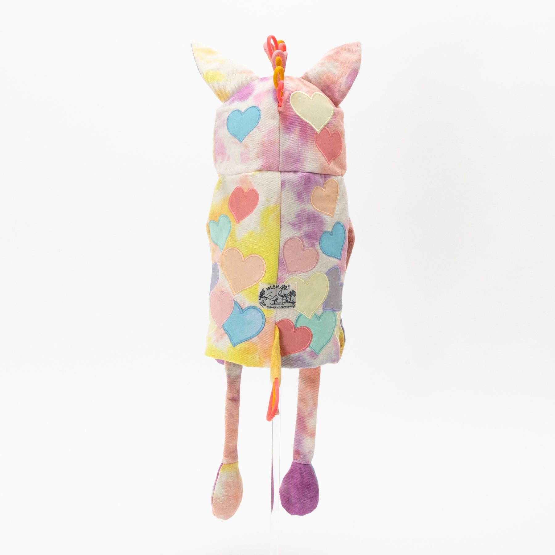 タイダイされた素材にカラフルリフレクター素材のハートアップリケ