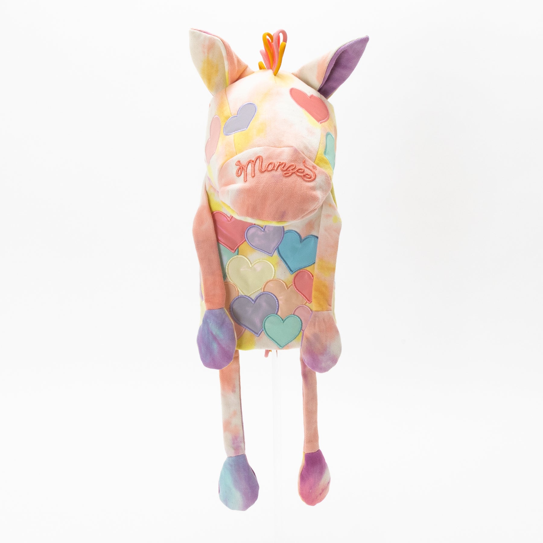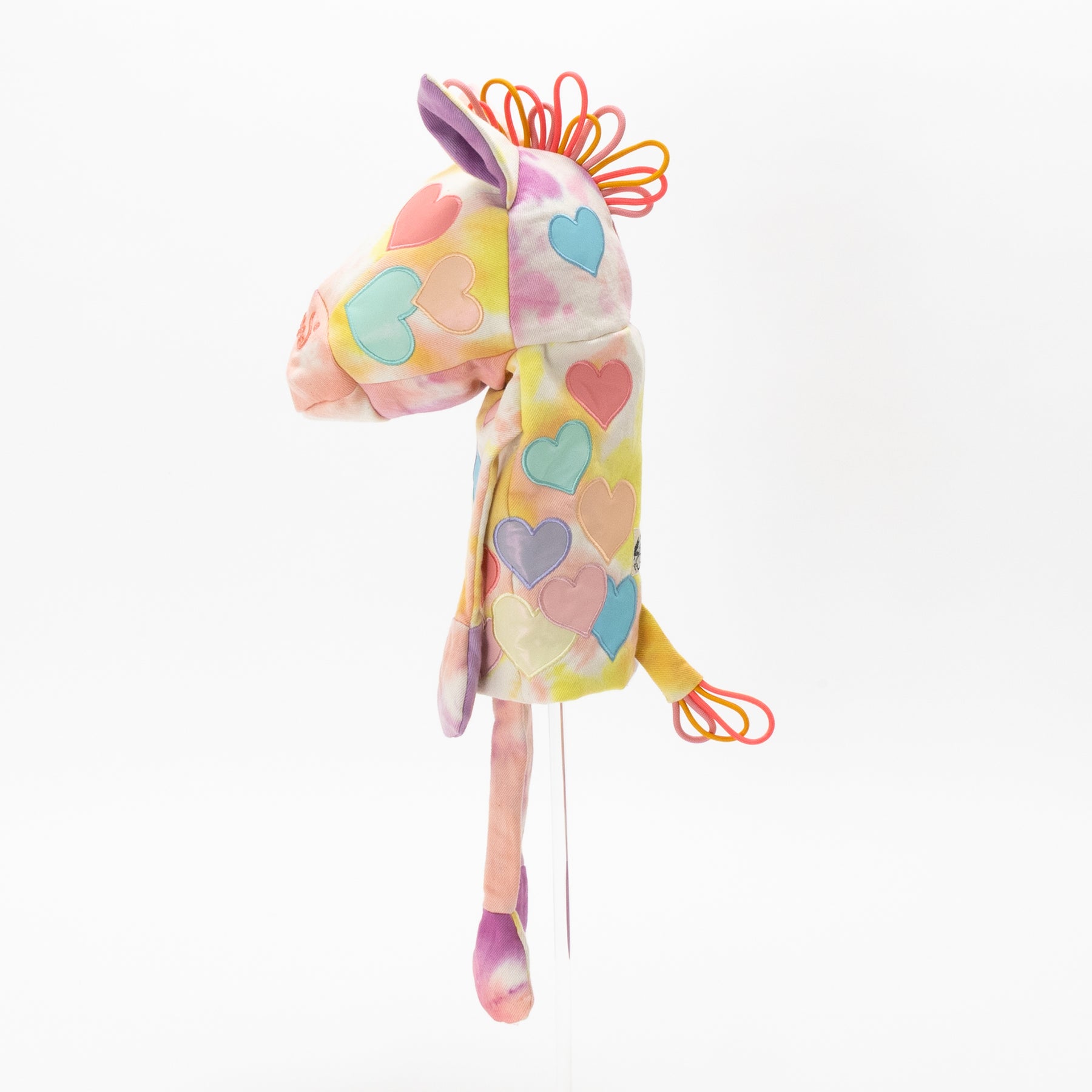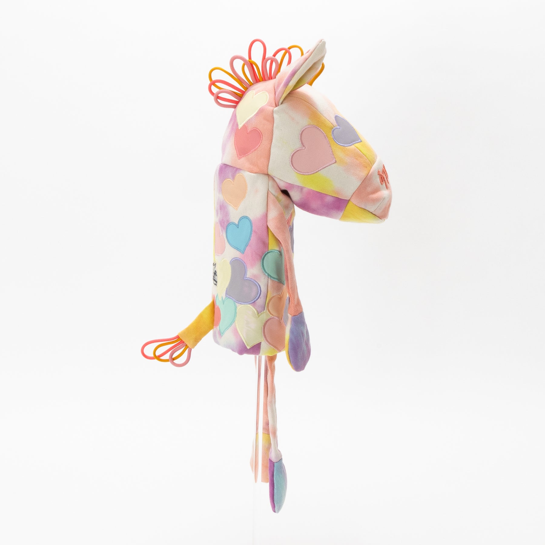 タイダイされた素材にカラフルリフレクター素材のハートアップリケ