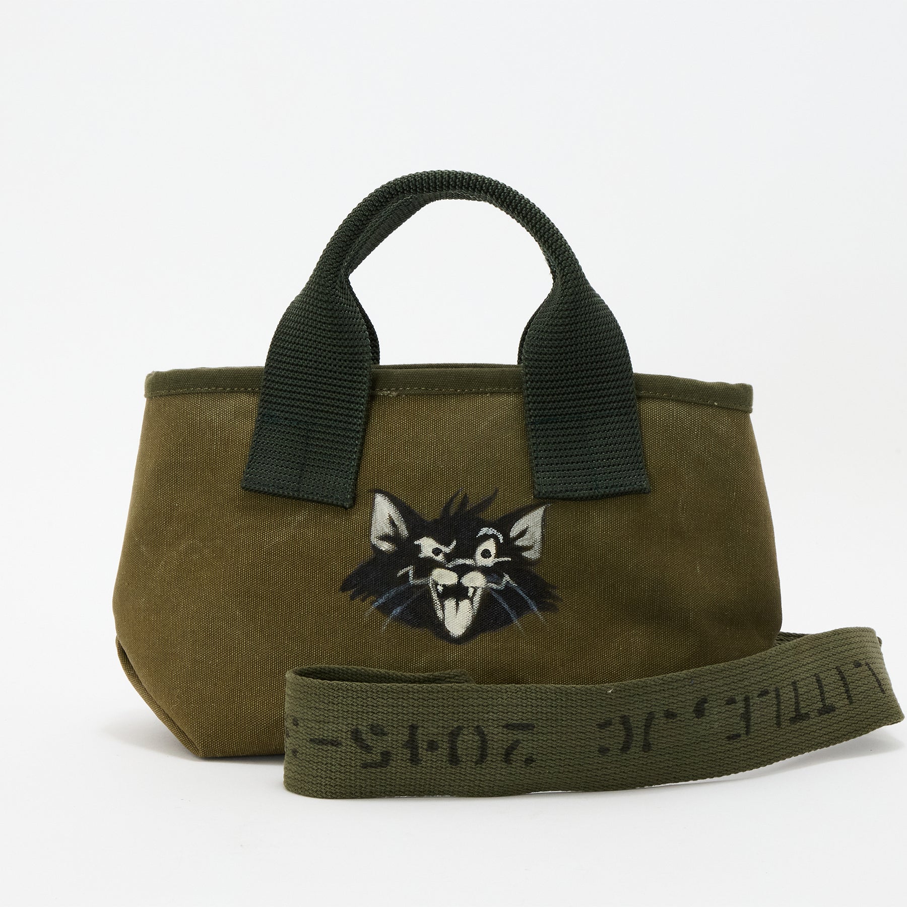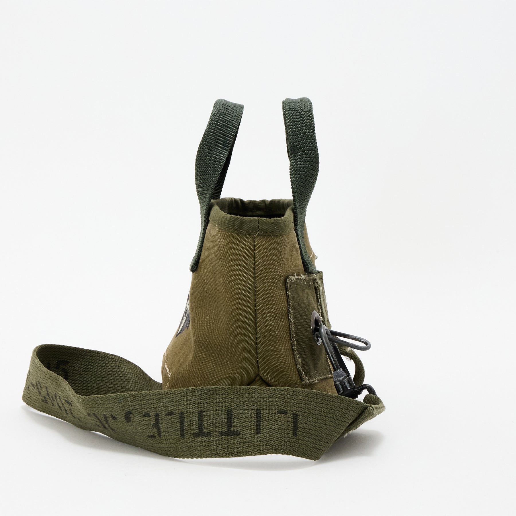 ヴィンテージミリタリー素材に落書きショルダーは飾りです。肩に掛けれる位置にはございません。ご理解のある方のみご購入お願いします。上部横幅:30cm 高さ:17.5cm底まち:13.5cm本体:日本製